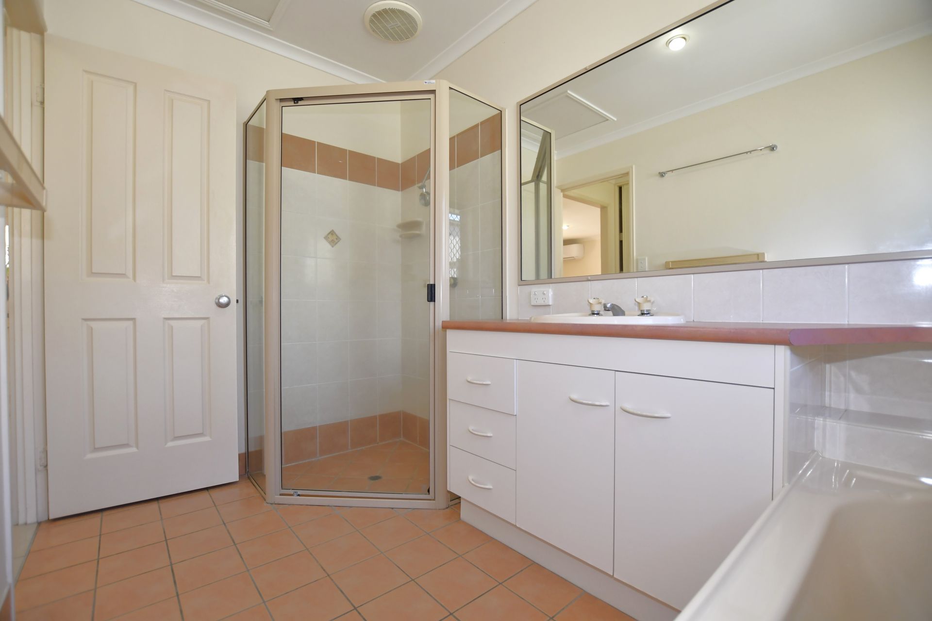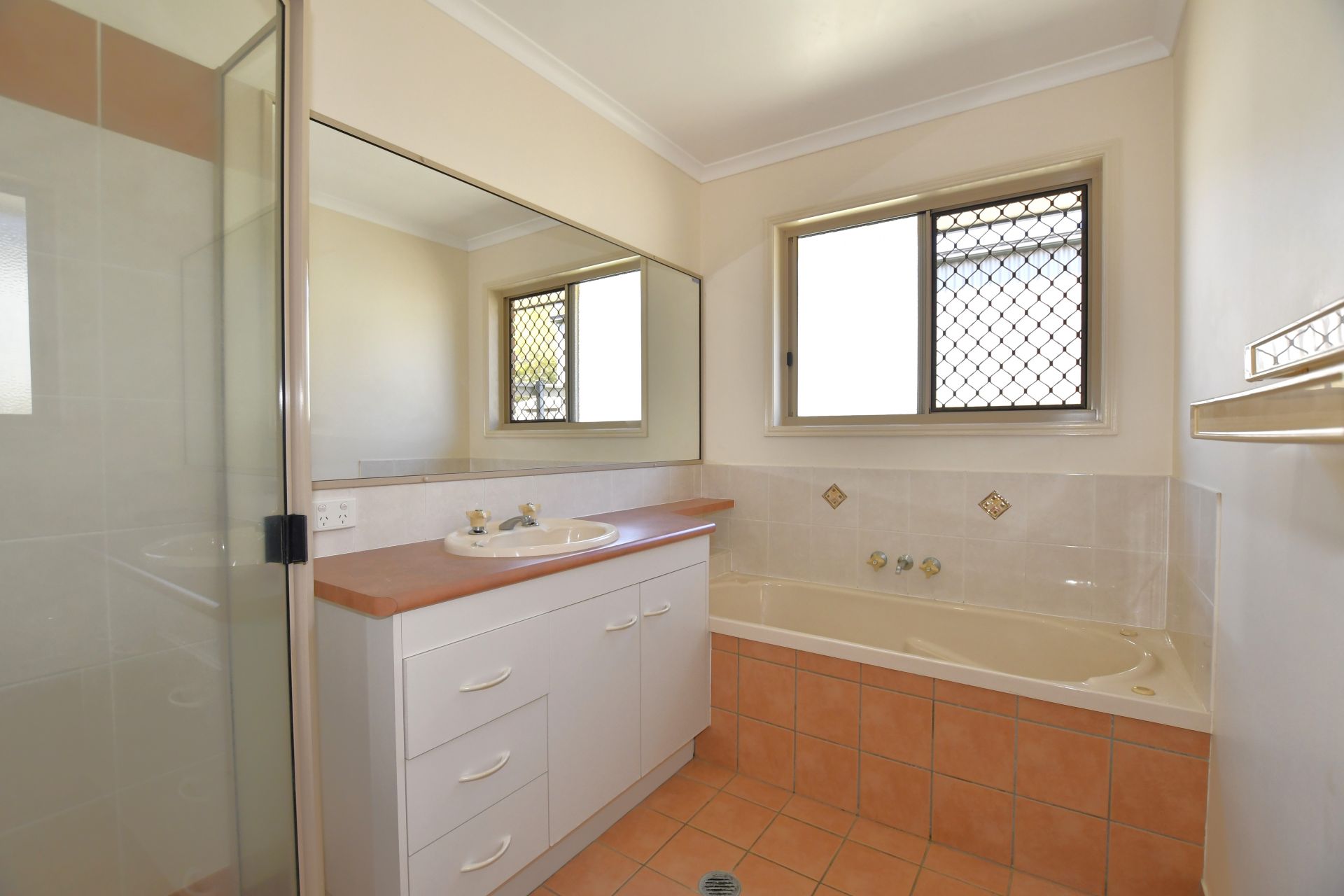 • The bathroom offers a large shower, bath and vanity, accompanied by a separate toilet