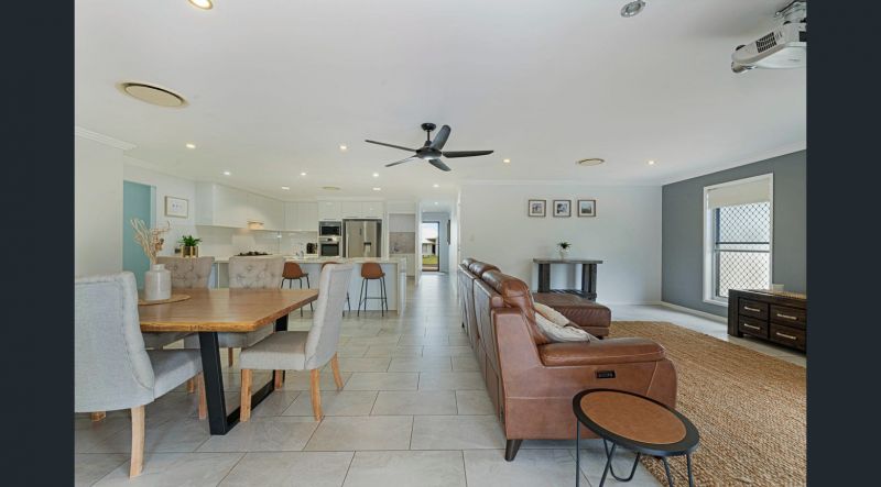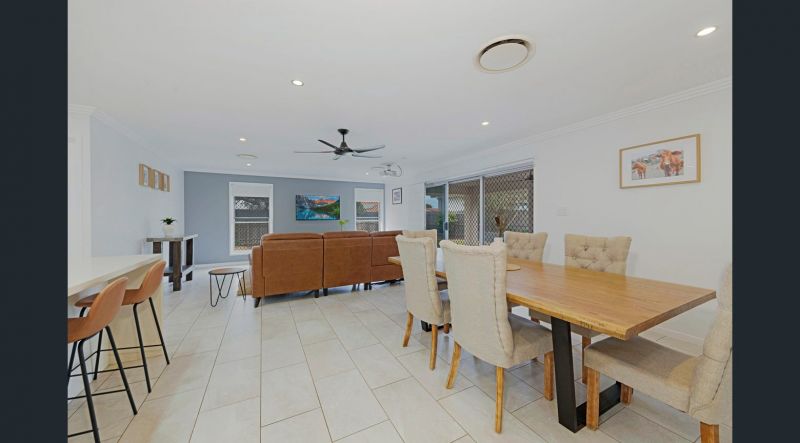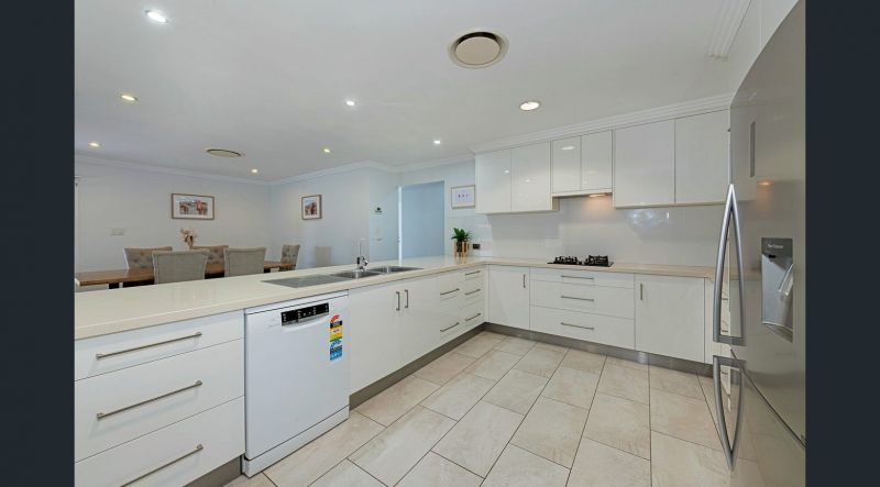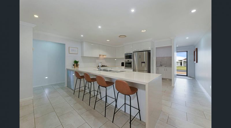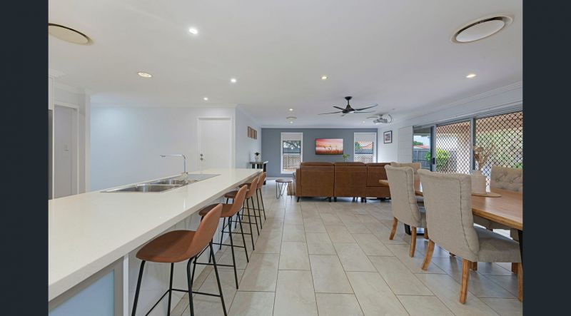 This spacious home has an open-plan living, dining and kitchen area with ducted air conditioning throughout the entire house, which is individually zoned. The living room has a built-in projector for family movie nights and flows seamlessly to the outdoor entertainment area. The vast kitchen provides ample storage and bench space, gas cooking, soft-close draws, stone benchtops, and a breakfast bar. A dedicated butler's pantry also offers a second sink and plenty of extra room for storage.