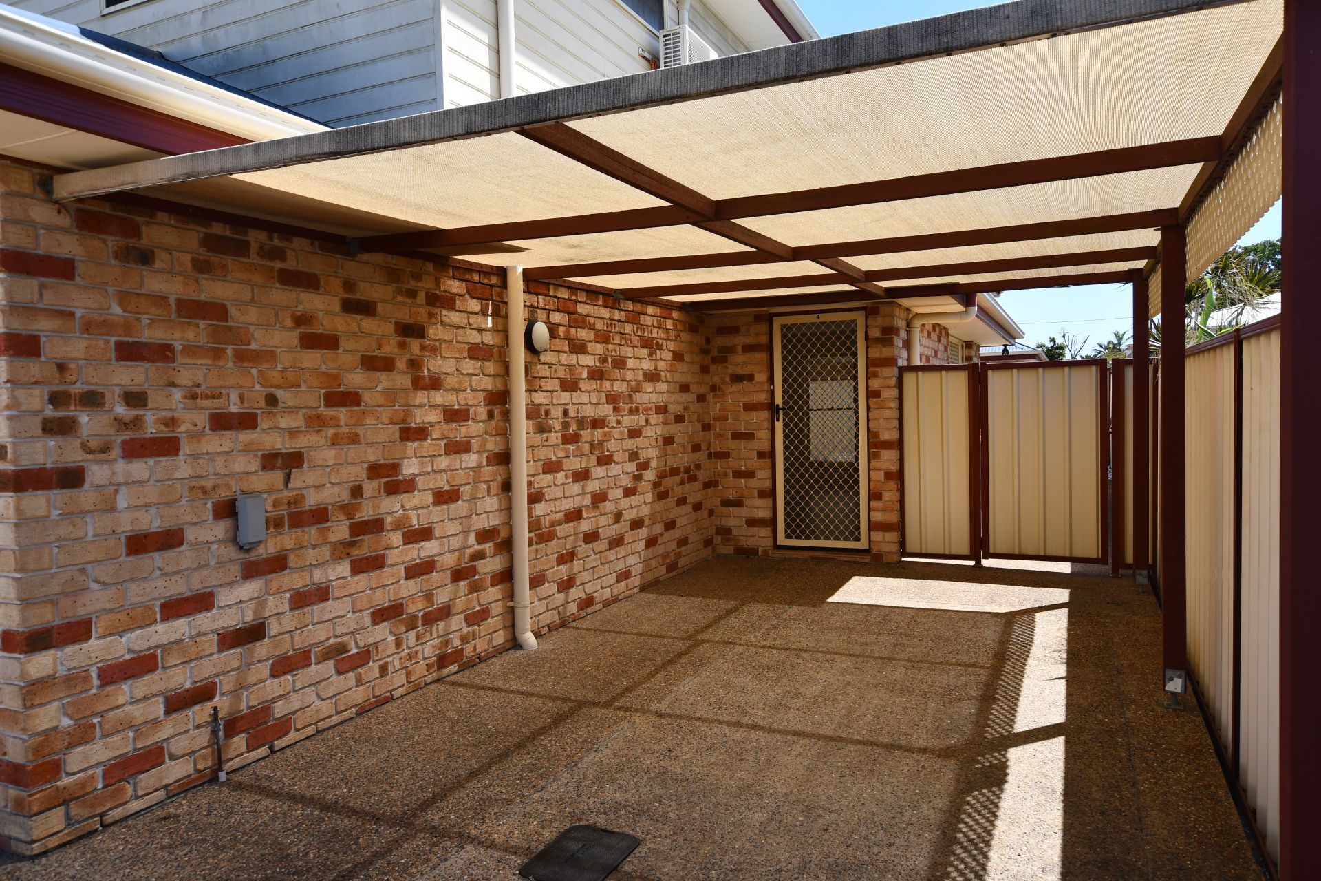 - Fenced backyard with covered area and clothesline.