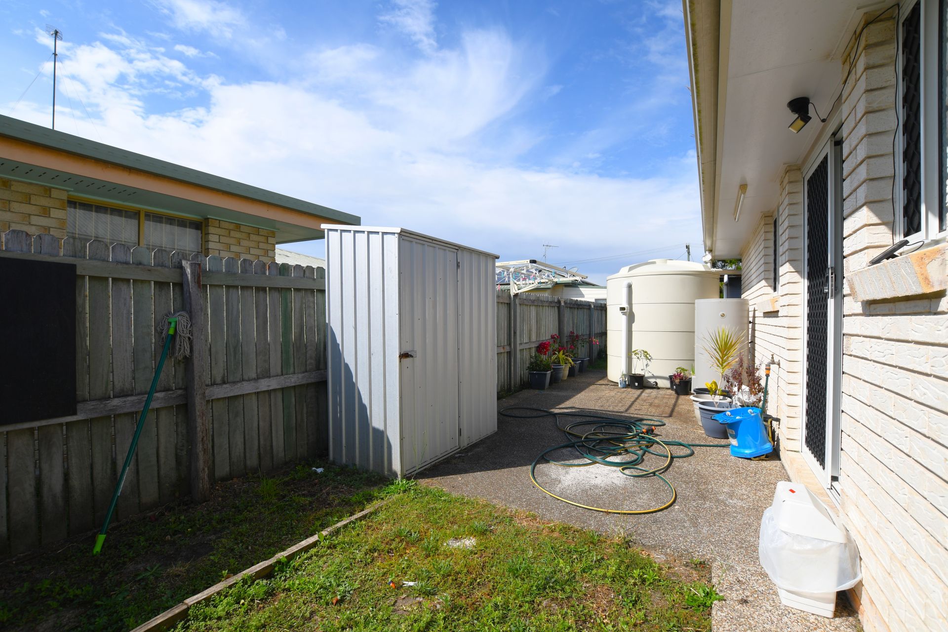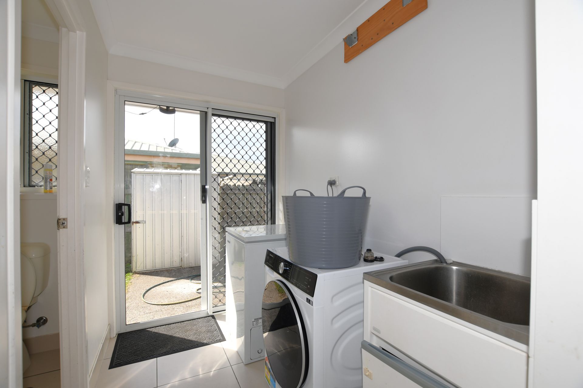 • Laundry is a good size enough space for a washing machine and dryer. Single tall cupboard for brooms and linen. Rear door access to outside