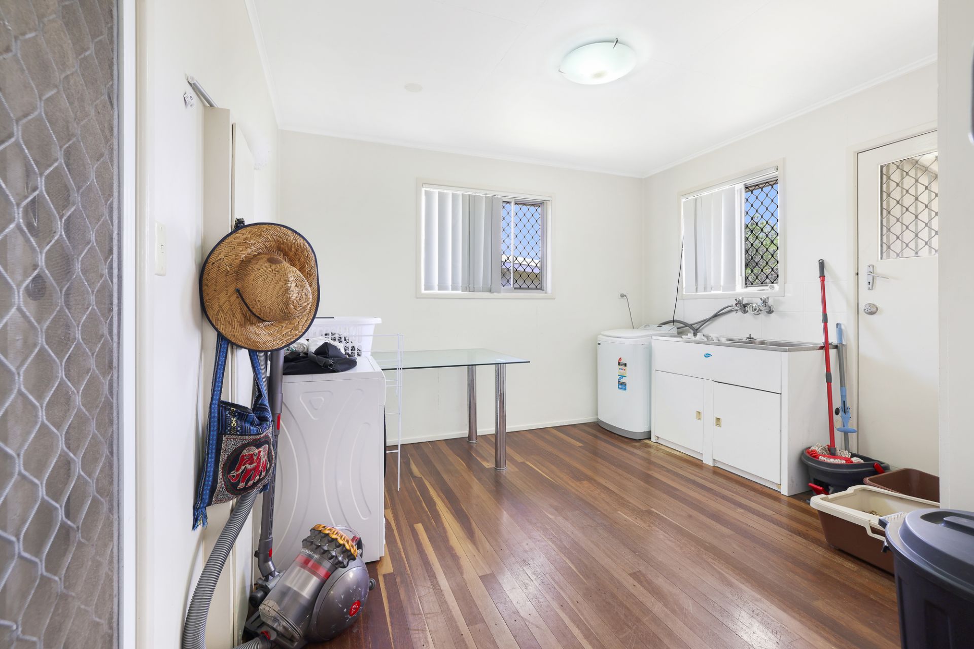 • Large laundry with double wash tubs and a built-in cupboard