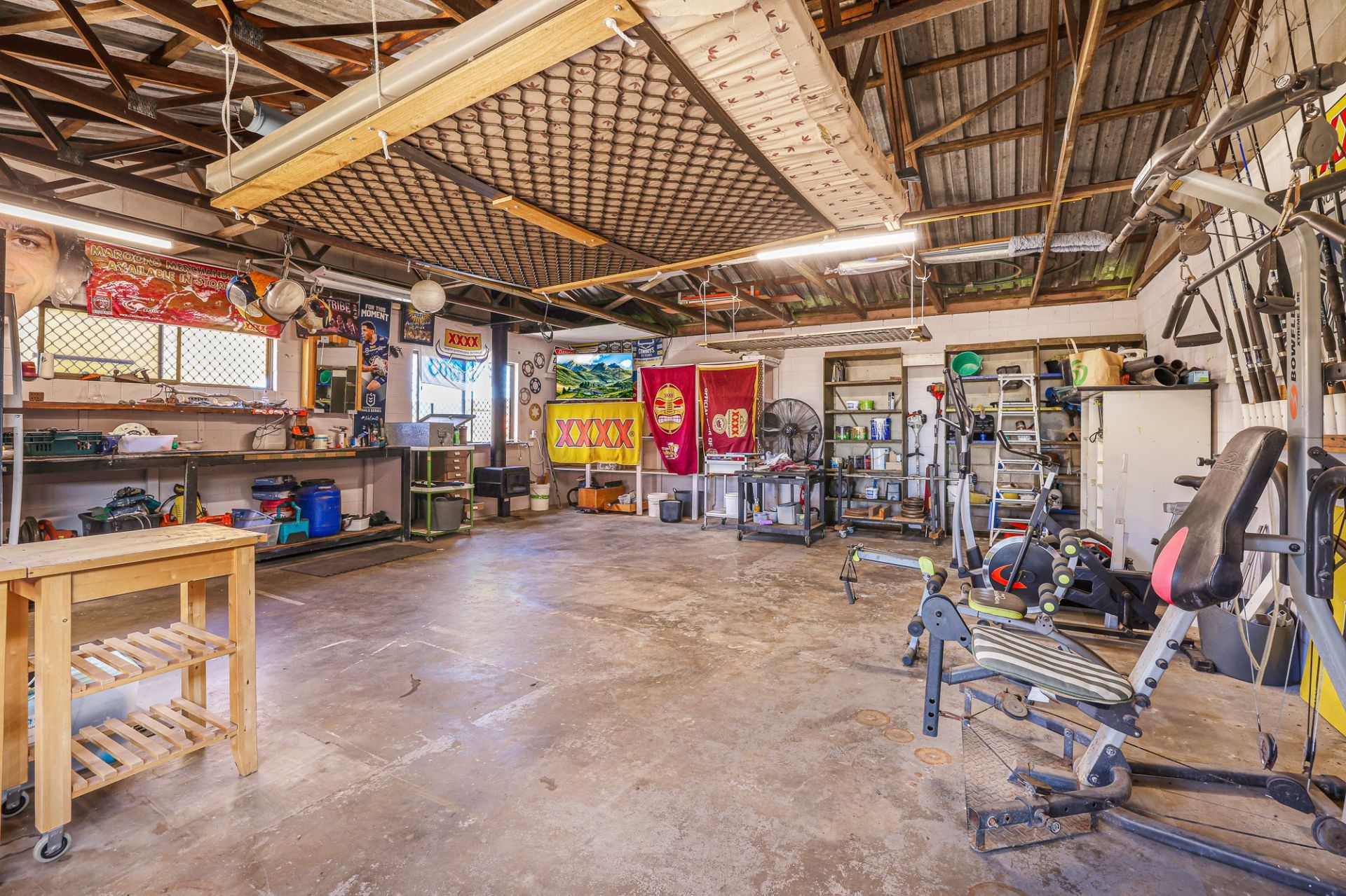 • Single bay besser block shed approximately 8m x 8m complete with workshop + Built in fireplace and a single carport